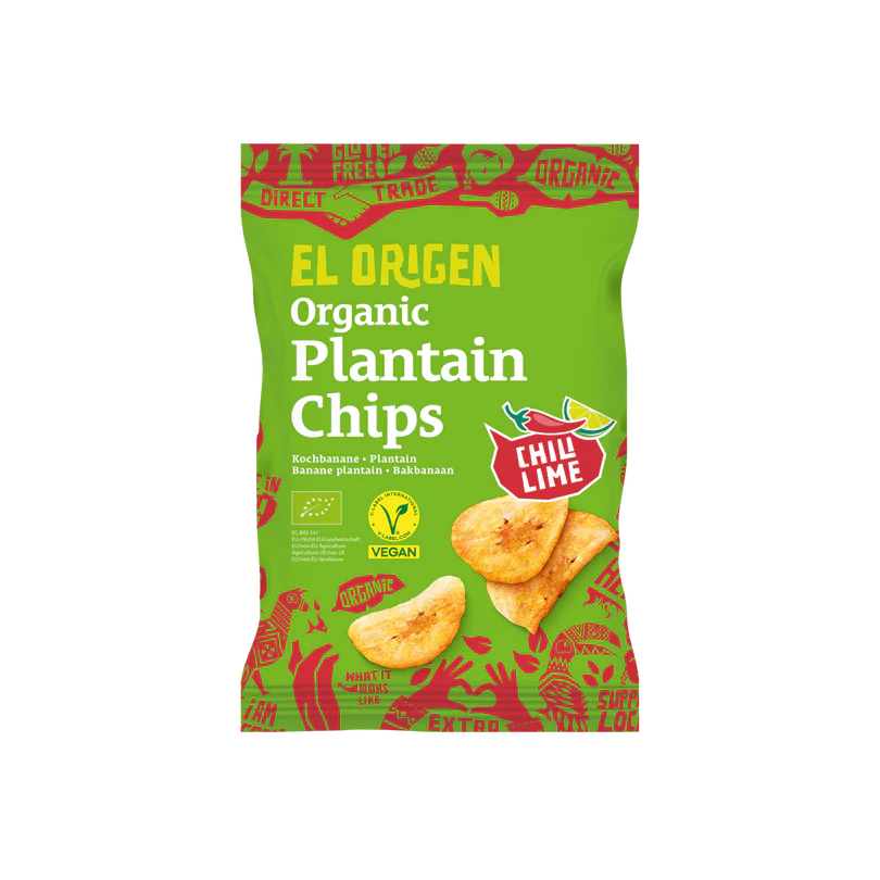 CHIPSURI DIN BANANE PLANTAIN - CU CHILLI SI LIME - 80g. Produs ECO, vegan, fara gluten, fara ulei de palmier, fara arome artificiale sau aditivi. Ingrediente: banane plantain* (57,6%), ulei de floarea soarelui*, sare de mare, suc de lamaie (1,6%), pudra uscata de chilli* (0,4%), acid citric. *= certificat ecologic. Declaratie nutritionala (valori medii pt. 100 g produs): valoare energetica: 517 kcal/2163 kJ; grasime: 29 g, din care acizi grasi saturati: 3,7 g; glucide: 60 g, din care zaharuri: 0,8 g; fibre: 5,8 g; proteine: 1,4 g; sare: 1,2 g.